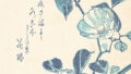 渦巻きのような鮮やかな背景に、ハットとステッキ・手にはユリを持ったフェネオンが佇む。